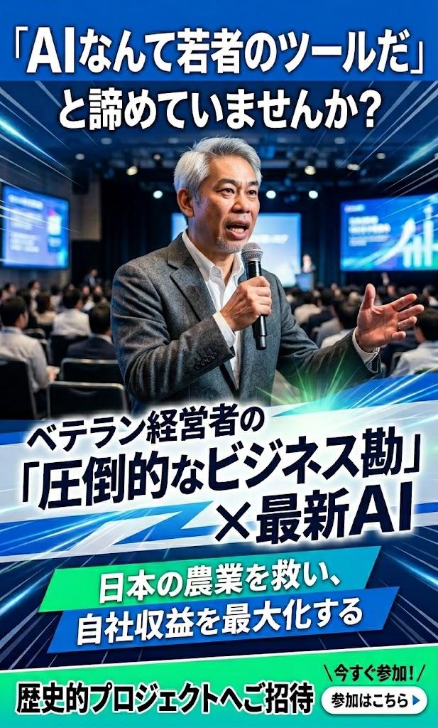 さて、長年ビジネスの最前線で戦ってこられた皆様。 今、世間では「AI」「ChatGPT」と騒がれていますが、こんなお悩みはありませんか?「デジタル集客が大切なのはわかるが、何から手をつけていいか分からない」「外注費ばかりがかさみ、費用対効果が合っていない」「自社の売上を上げるだけでなく、もっと社会に貢献できる事業がしたい」もし一つでも当てはまるなら、この先を必ずお読みください。 皆様の悩みをすべて解決し、さらに**「日本の農業を救う」**という壮大なビジョンを実現する、全く新しいリスキリング研修『AxSALON』の全貌を公開します。