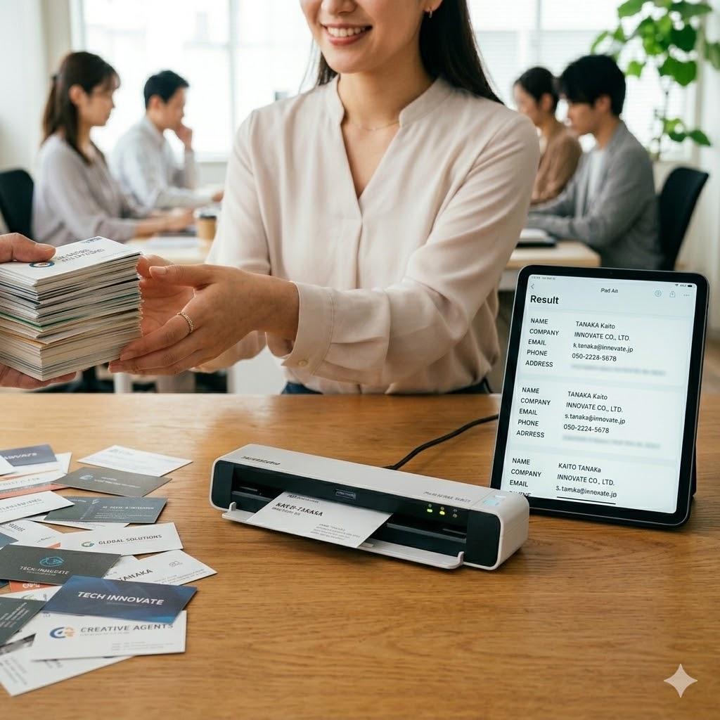お手元の名刺をまとめてお預かりし、1枚ずつデジタル化