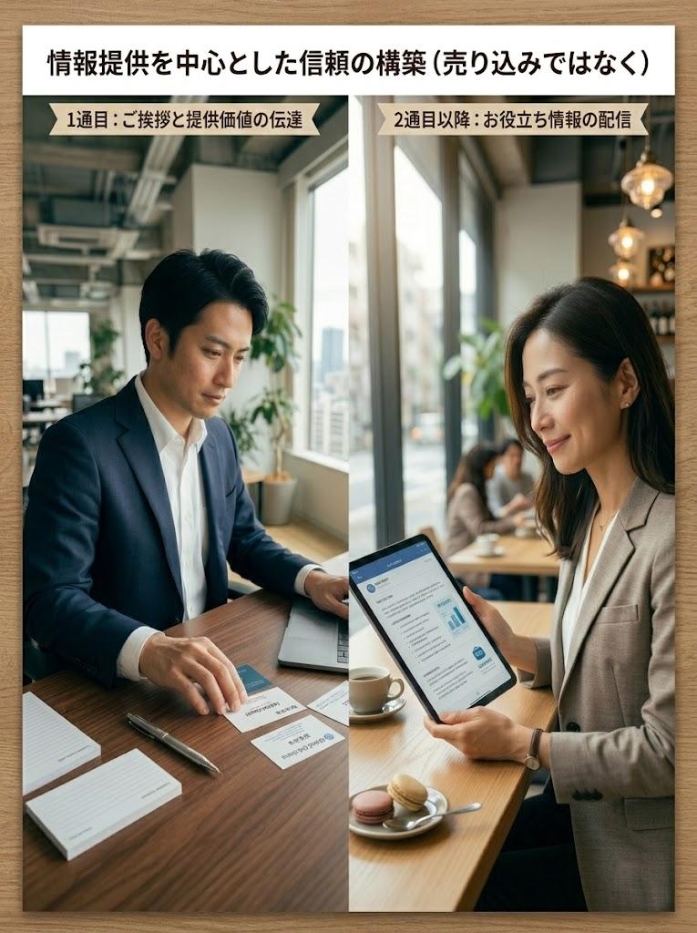 初回のご挨拶DM2通目以降の“価値提供メイン”のシナリオ例LINE公式アカウントへの自然な誘導方法